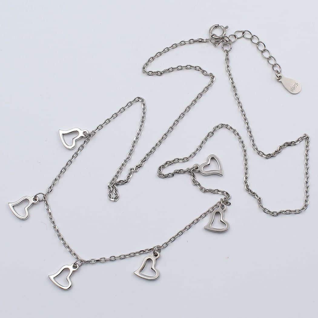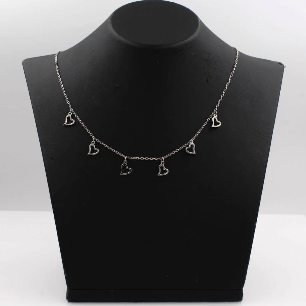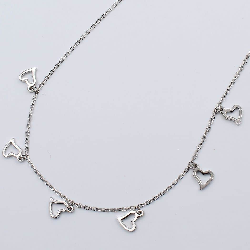 Umesto jednog centralnog priveska, ovu ogrlicu krase višestruki privesci u obliku srca koji su ravnomerno raspoređeni duž prednjeg dela lančića. Srca su dizajnirana kao elegantne, polirane konture, što ogrlici daje vizuelnu lakoću i moderan izgled. Prilikom nošenja, privesci se nežno pomeraju i presijavaju, stvarajući prelep efekat.
