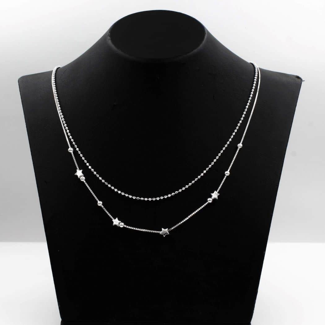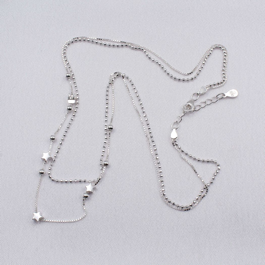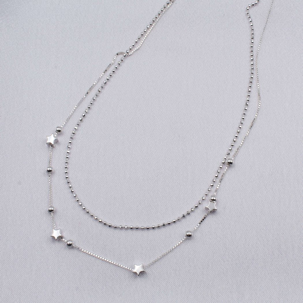 Otkrijte eleganciju u slojevima uz ovu predivnu duplu ogrlicu od srebra 925. Savršen spoj klasičnog lančića ukrašenog zvezdicama i svetlucavog niza kuglica čini ovaj komad idealnim za moderan i sofisticiran izgled.