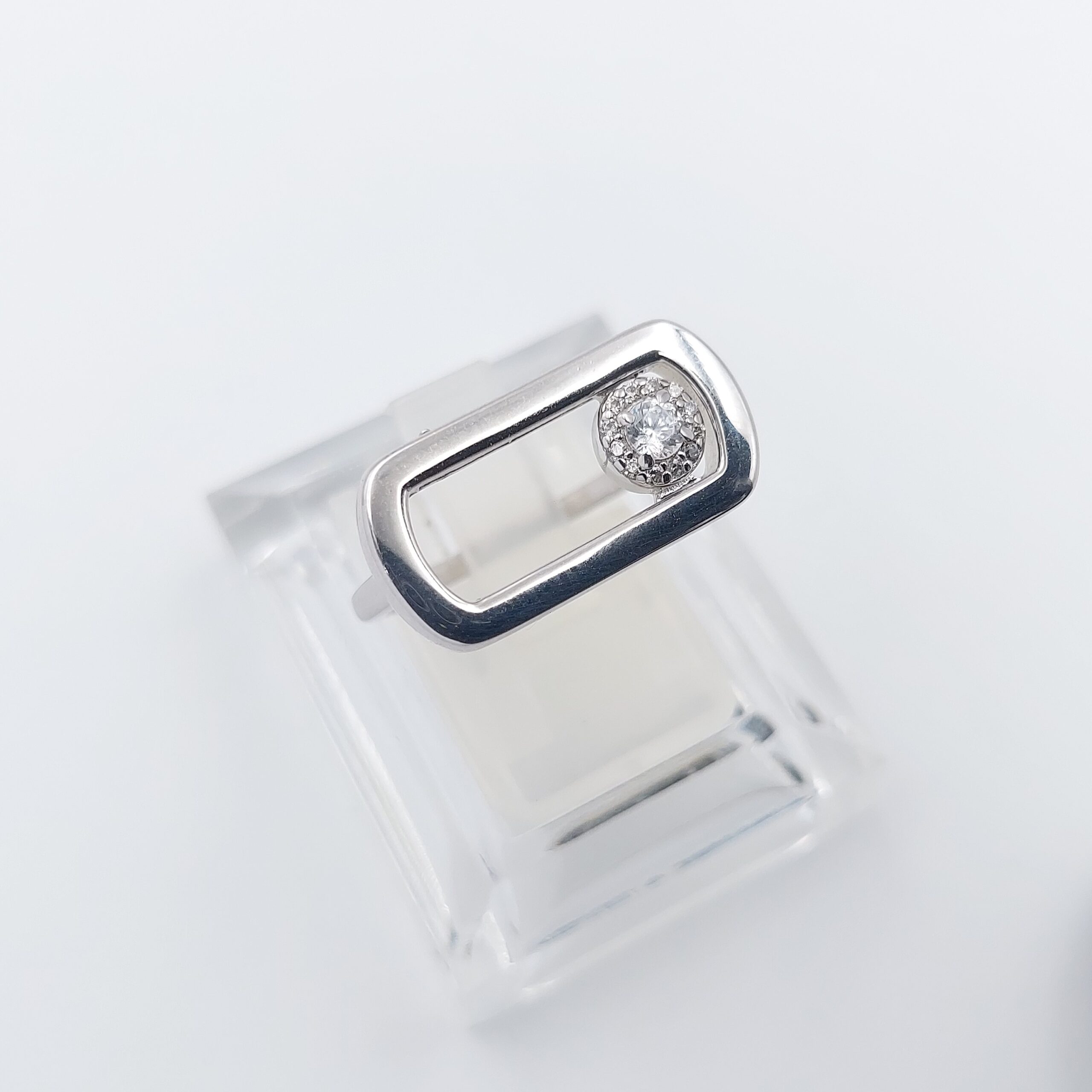 Igra oblika i prostora Glavni motiv prstena je zaobljeni pravougaoni okvir koji dominira dizajnom. Unutar ovog otvorenog prostora („negative space“), smešten je kontrastni element – okrugli klaster cirkon koji se pomera. Ovaj detalj, koji se sastoji od većeg centralnog kamena okruženog sitnijim cirkonima (halo stil), postavljen je asimetrično unutar rama, dajući prstenu dinamiku i umetnički dojam.