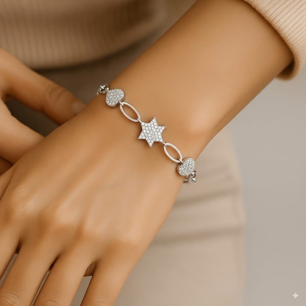 - Narukvica je izrađena od srebrnog metala i sastoji se od izduženih ovalnih karika koje povezuju ukrasne oblike — srca i zvezde — bogato ukrašene sitnim svetlucavim kamenčićima. Dizajn je moderan i upečatljiv, savršen za večernje izlaske ili svečane prilike.